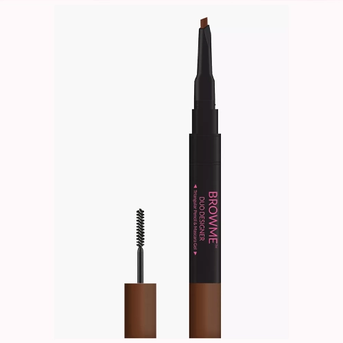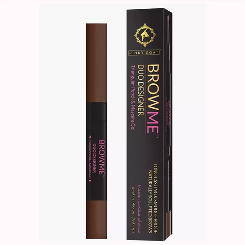 محصولی که تصویر آن را ارسال کردهاید، **Pinky Goat BrowMe Duo Designer** است که بهصورت یک محصول دوطرفه طراحی شده و برای طراحی و تقویت ظاهر ابروها کاربرد دارد. این محصول دو کاربرد اصلی دارد: یک طرف آن مداد ابرو (Brow Pencil) و طرف دیگر ژل ابرو (Mascara Gel) است که هر کدام به تنهایی یا در ترکیب با هم برای بهبود ظاهر و حالتدهی ابروها استفاده میشوند.