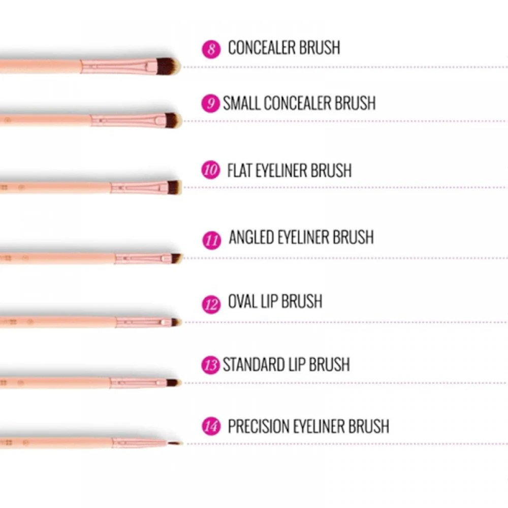 شامل ۱۴ براش کاربردی برای آرایش کامل طراحی زیبا با بدنه صورتی طلایی کیف آرایشی همراه با بستهبندی شیک الیاف نرم و بدون ریزش با کیفیت بالا مناسب برای مبتدیها و حرفهایها کاملاً وگان و بدون تست حیوانی مناسب انواع محصولات پودری، کرمی و مایع