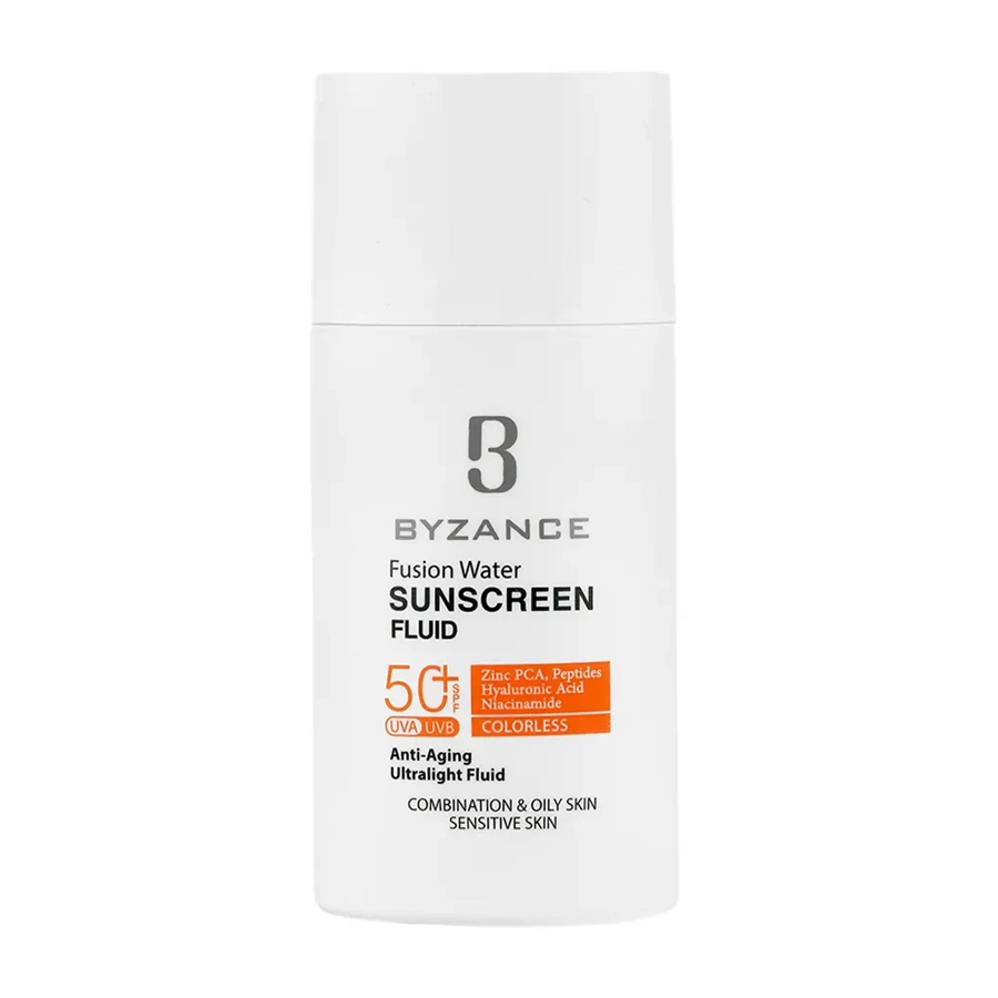کرم ضدآفتاب بیزانس مدل Fusion Water SPF50 یک فلوئید فوقالعاده سبک و بیرنگ است که محافظتی کامل در برابر اشعههای UVA و UVB فراهم میکند. این ضدآفتاب به لطف فناوری Fusion Water بهسرعت جذب پوست میشود، هیچ رد سفیدی باقی نمیگذارد و برای استفادهی روزانه در تمام فصول سال ایدهآل است. ترکیب قدرتمند زینک PCA، پپتیدها، نیاسینامید و هیالورونیک اسید باعث کنترل چربی، آبرسانی عمیق و کاهش علائم پیری پوست میشود.
