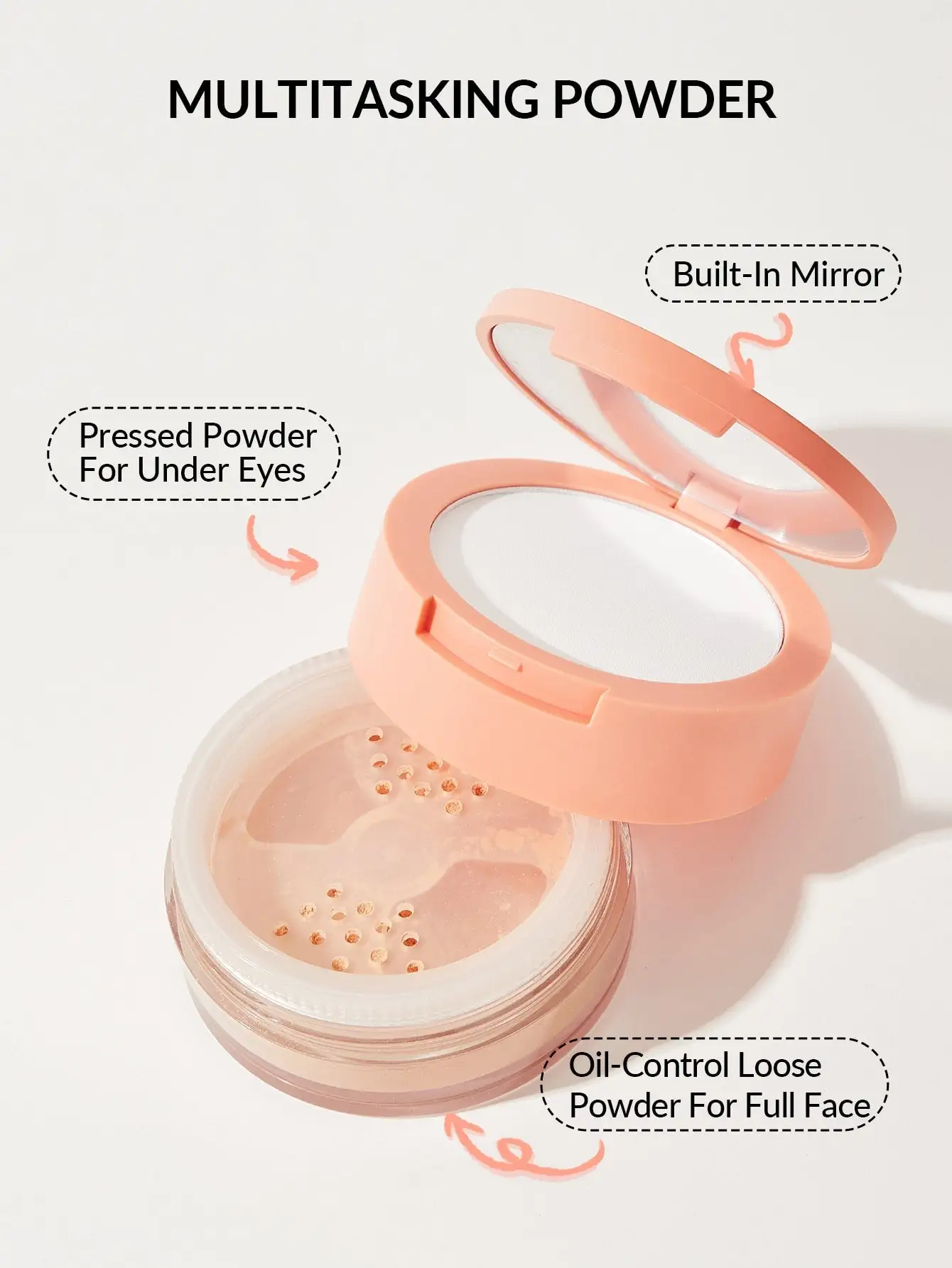 در یک بستهبندی جمعوجور و آینهدار، دو نوع پودر تخصصی قرار گرفته که یکی برای ناحیه حساس زیر چشم و دیگری برای فیکس کردن کل صورت طراحی شده است.